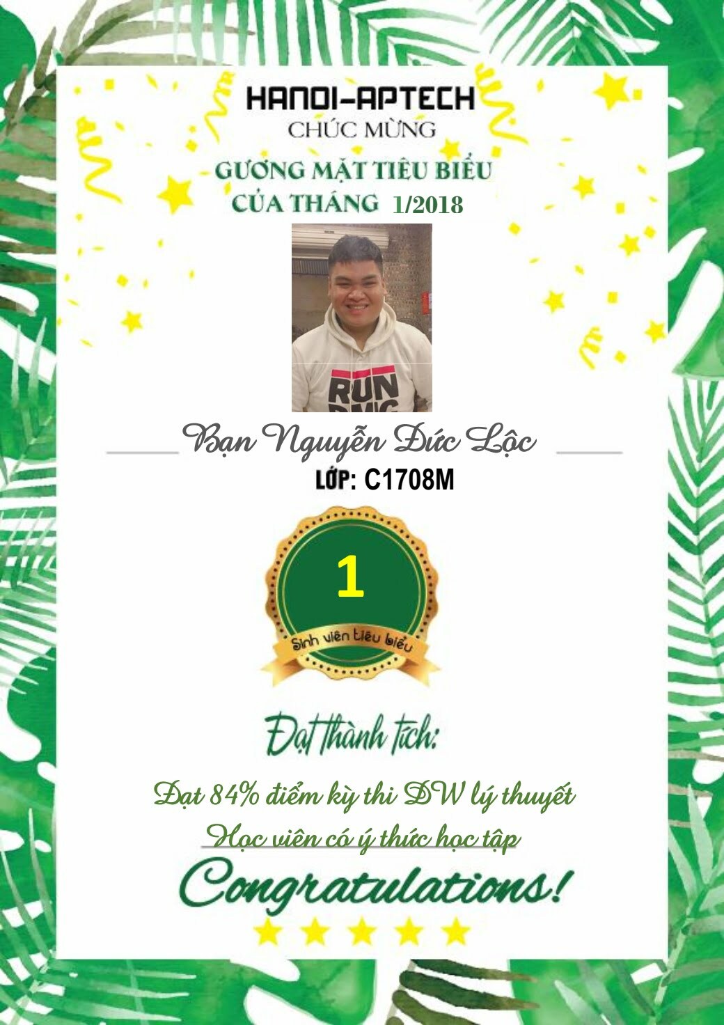 Trường Hanoi-Aptech chúc mừng bạn Nguyễn Đức Lộc, thành viên lớp C1708M đã được bầu chọn là Gương mặt Học viên Tiêu biểu của tháng 1/2018. Chúc bạn có nhiều thành công hơn nữa trong thời gian tiếp theo.