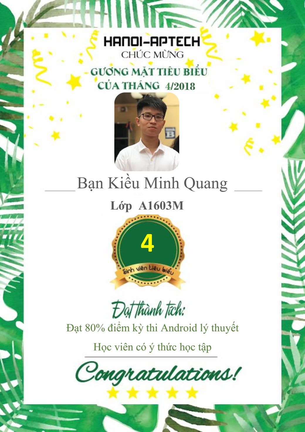Được bầu chọn là Gương mặt Học viên Tiêu biểu của tháng 4/2018.