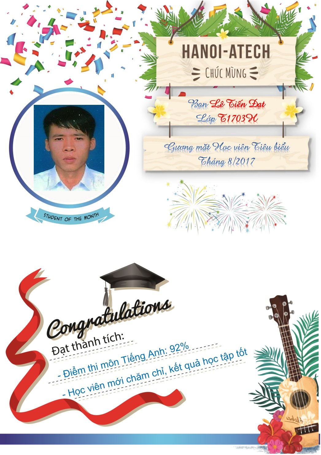 Trường Hanoi-Aptech chúc mừng bạn Lê Tiến Đạt, thành viên lớp T1703H đã được bầu chọn là Gương mặt Học viên Tiêu biểu của tháng 8/2017. Chúc bạn có nhiều thành công hơn nữa trong thời gian tiếp theo.