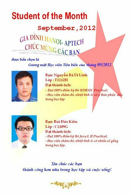 Học viên tiêu biểu Tháng 09/2012Post published:03/10/2012Post category:Gương mặt tiêu biểuXin chúc mừng 2 bạn: Nguyễn Bá Út Linh và Bùi Đức Kiên đã đạt danh hiệu học viên tiêu biểu của tháng 09/2012. Tags: gương mặt học viên, học viên Hanoi-Aptech, học viên tiêu biểu, tháng 10
