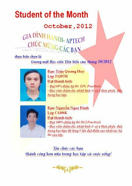 Học viên tiêu biểu tháng 10/2012Post published:02/11/2012Post category:Gương mặt tiêu biểuXin chúc mừng 2 bạn: Trần Quang Huy và Nguyễn Ngọc Đinh đã đạt danh hiệu học viên tiêu biểu của tháng 10/2012. Tags: gương mặt học viên, Hanoi-Aptech, học viên tiêu biểu, tháng 10
