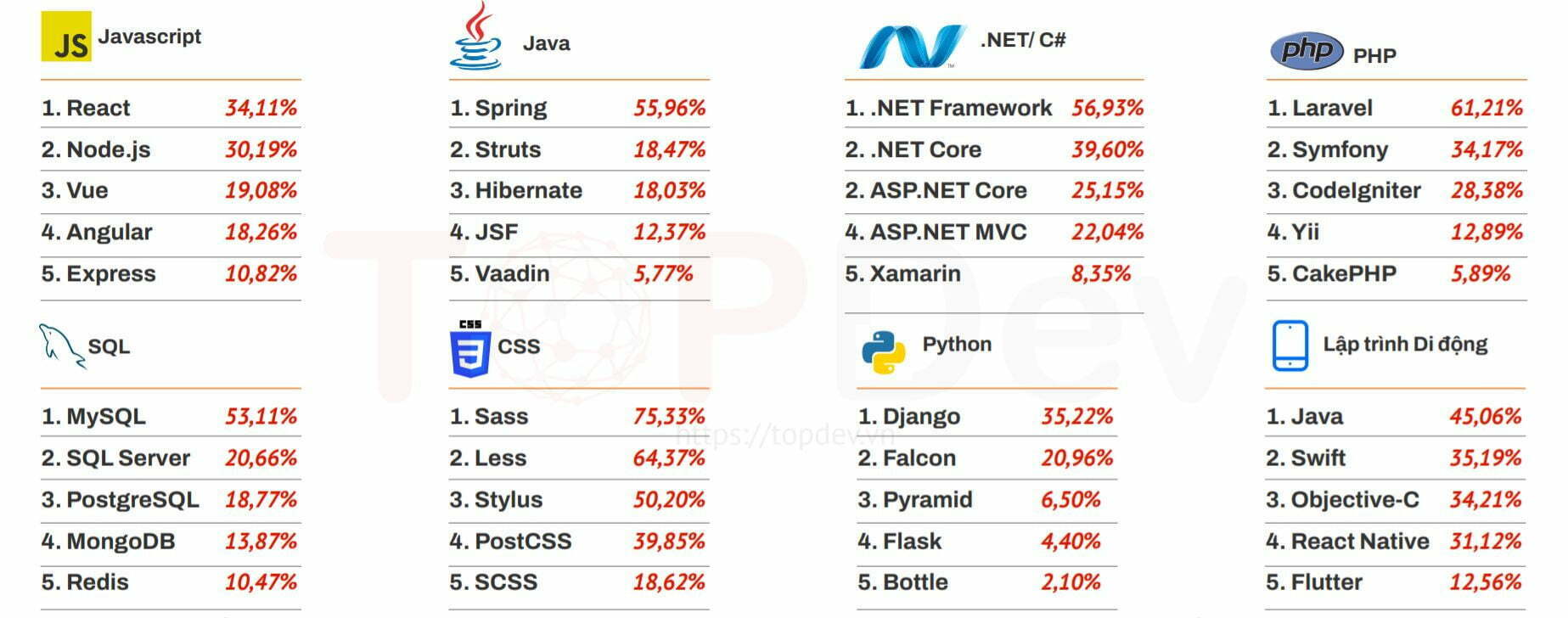 React, MySQL, Spring, Laravel, Sass, Django và Django là những công nghệ phổ biến nhất trong nhóm công nghệ tương ứng. Và JavaScript vẫn là ngôn ngữ phổ biến nhất cùng với các kỹ năng IT khác.