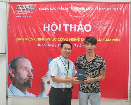 Đặc biệt phần cuối của hội thảo, đại diện nhà trường đã trao chiếc điện thoại Samsung Galaxy S3 sành điệu cho bạn Nghiêm Xuân Thiệu – một thành viên mới của gia đình Hanoi-Aptech vì bạn đã đăng ký tham gia chương trình Quyết định là của bạn.