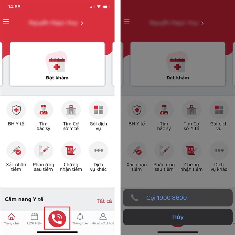 Nếu gặp triệu chứng bất thường, bạn có thể liên hệ nhanh với bác sĩ, cán bộ y tế bằng cách nhấn vào nút Điện thoại màu đỏ > gọi 1900 8600.