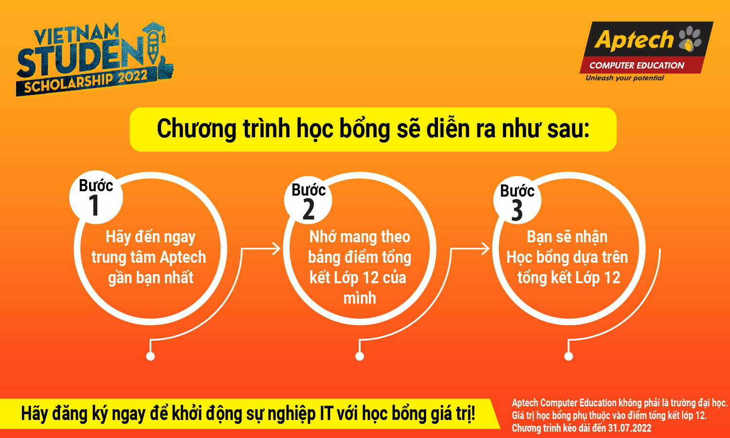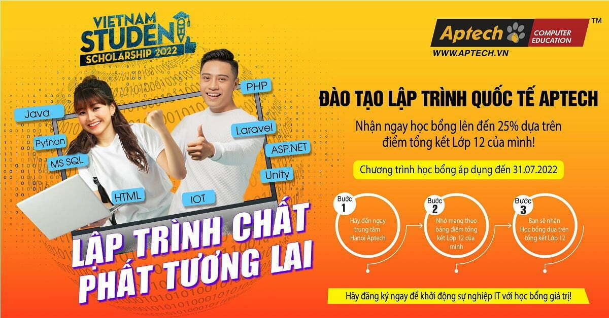 Muốn học lập trình hay thì đến ngay Aptech! Vì ngay lúc này, Aptech đang trao tặng vô số học bổng giá trị cho các học viên mới, áp dụng đến hết 31.07.2022. Thông qua kết quả điểm trung bình tổng kết lớp 12 của bạn, Aptech sẽ trao cho bạn học bổng xứng đáng để theo học ngay tại bất kỳ trung tâm Aptech nào ở Việt Nam.